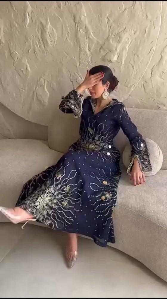 فستان عصري في تصميمها حتى تتواكب مع الأزياء العصرية والموضة الحديثة .
