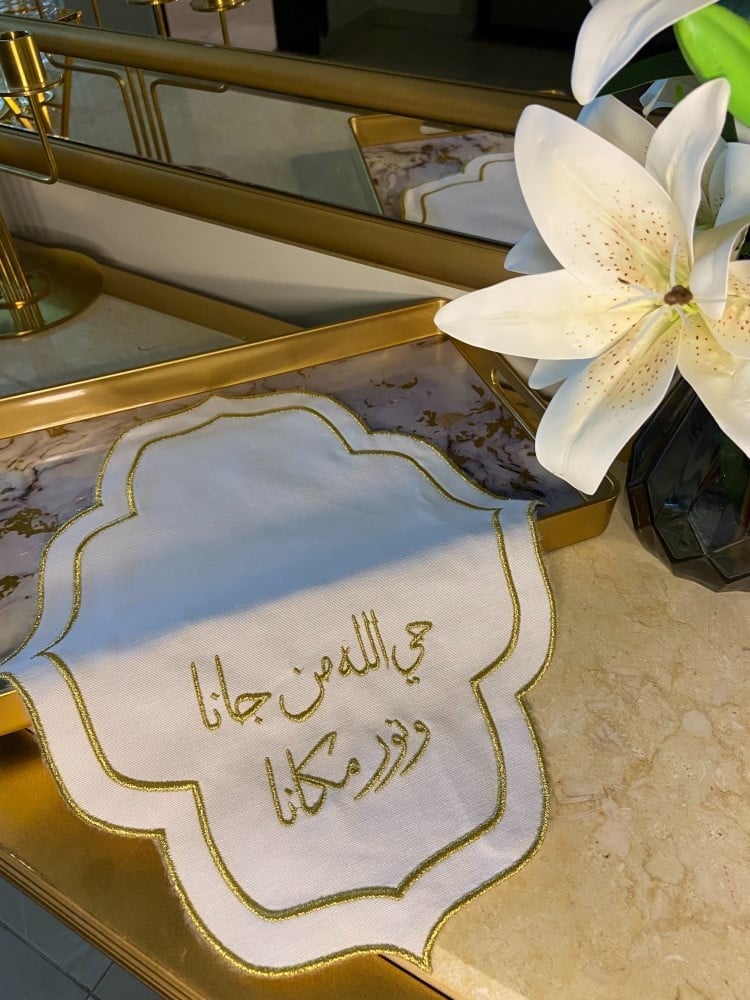 تفاصيل المنتجمفرش تطريز استقبال الضيوفمفارش ضيافةيمكنك اختيار التطريز أو العباره حسب اختيارك بالون الذهبي أو الفضي من متجر-رنا