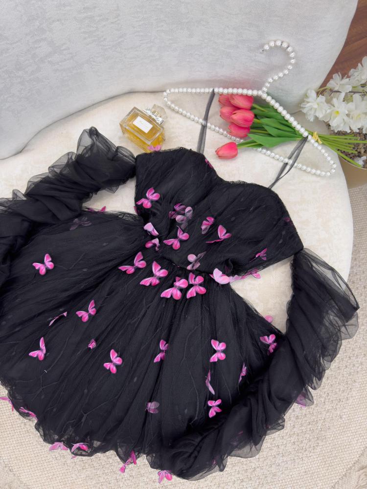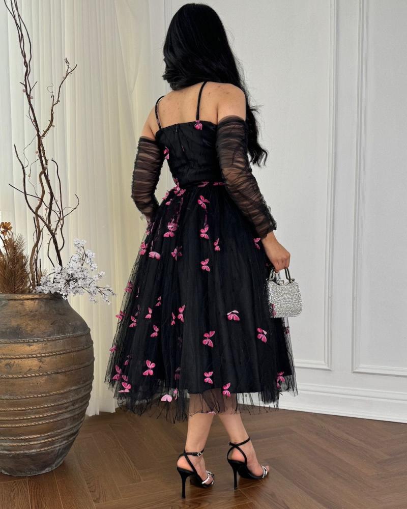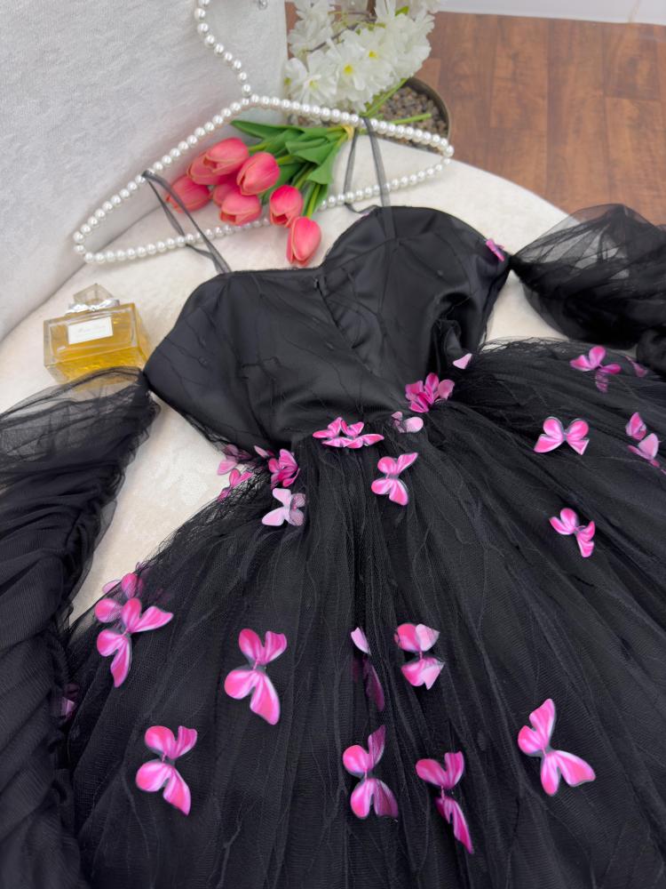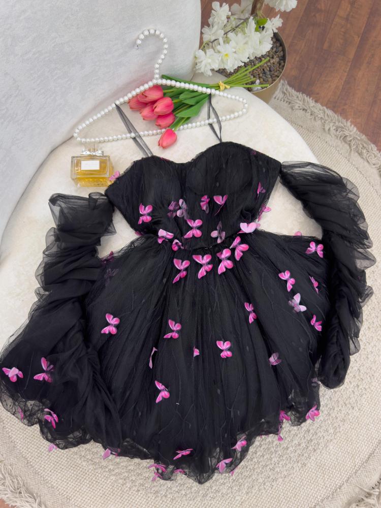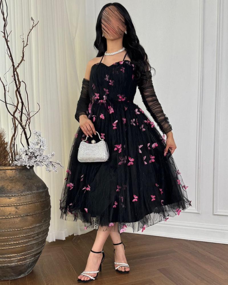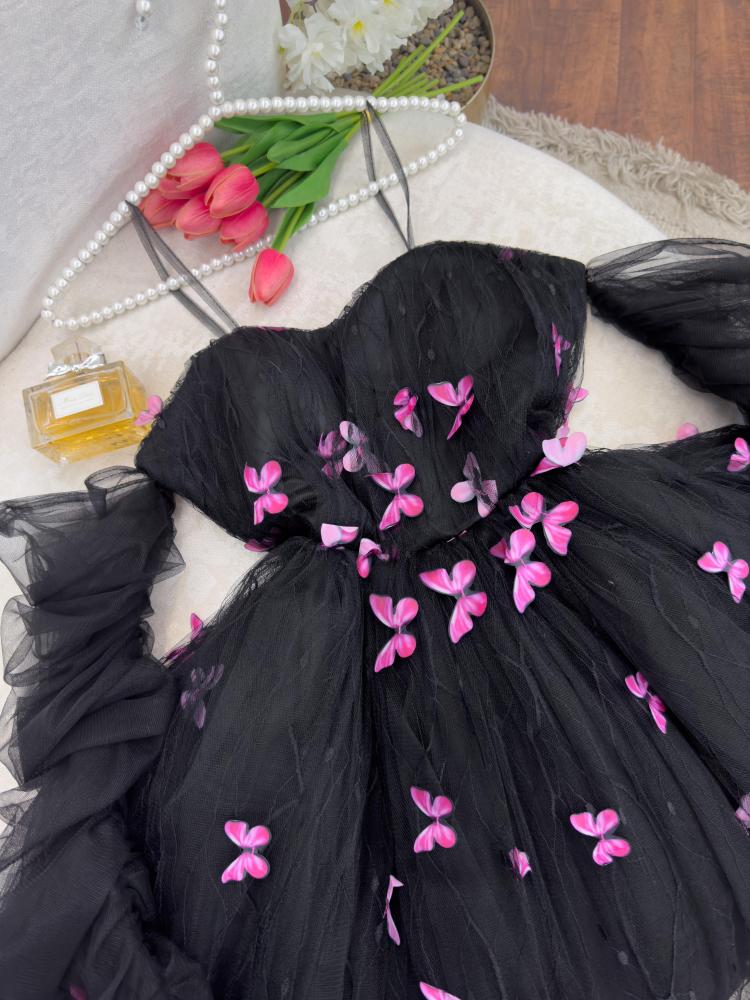 فستان تل أسود قصير بأكمام زم شفافة