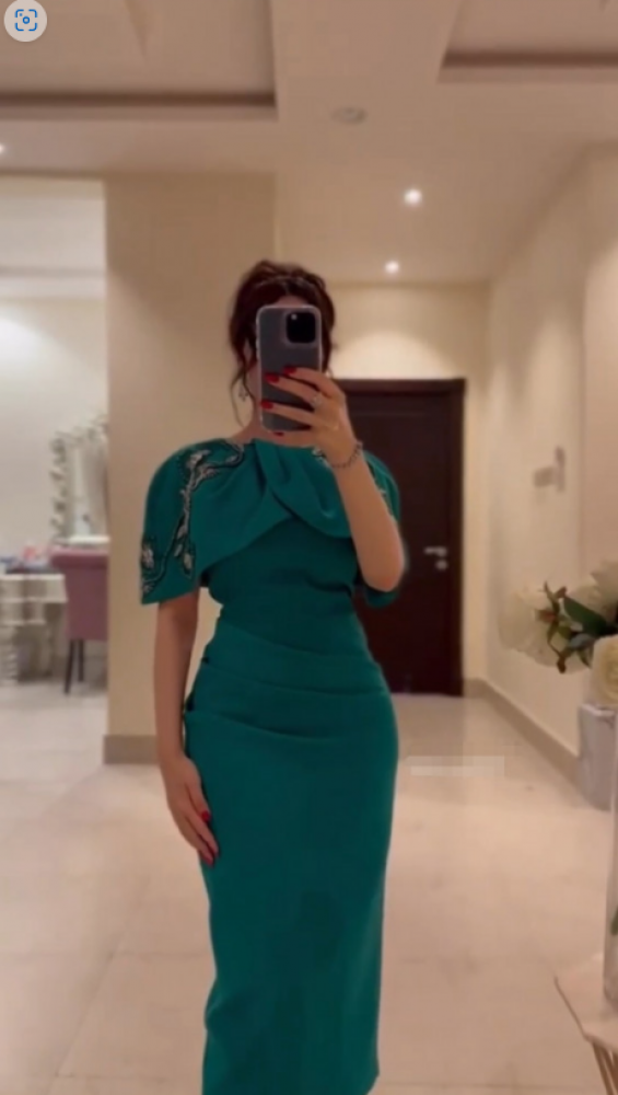 فستان سهرة تركواز تفتة استرتش بتطريز عالكتف والصدر