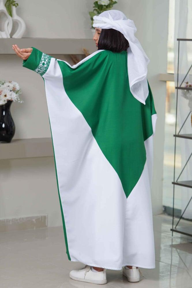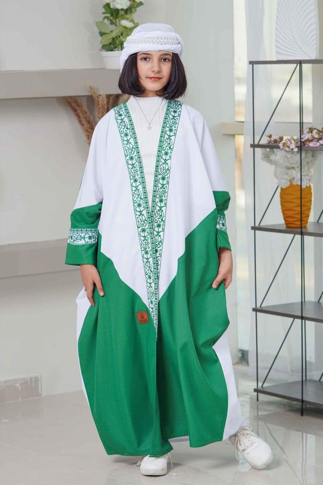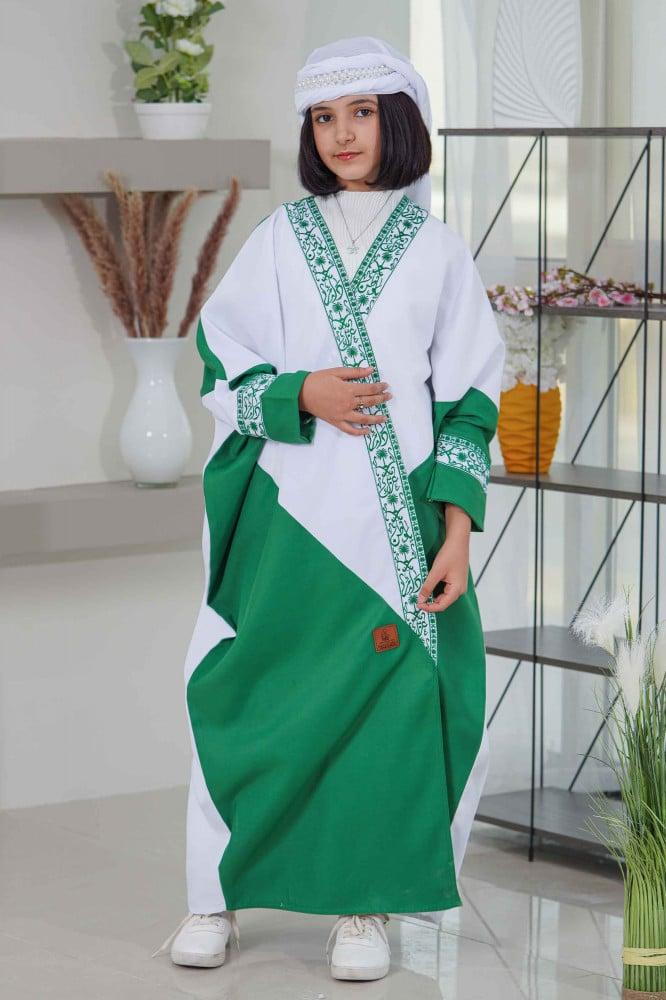أرقى تصميم بشت بناتي بياقة مطرزة بزخارف مستوحاة من التراث السعودي العريق للصغيرات الأنيقات من تشكيلة أزياء اليوم الوطني، بقماش كريب ناعم بلون أبيض وأخضر ليضفي إطلالة مشرقة لطفلتكِ في اليوم المميز!