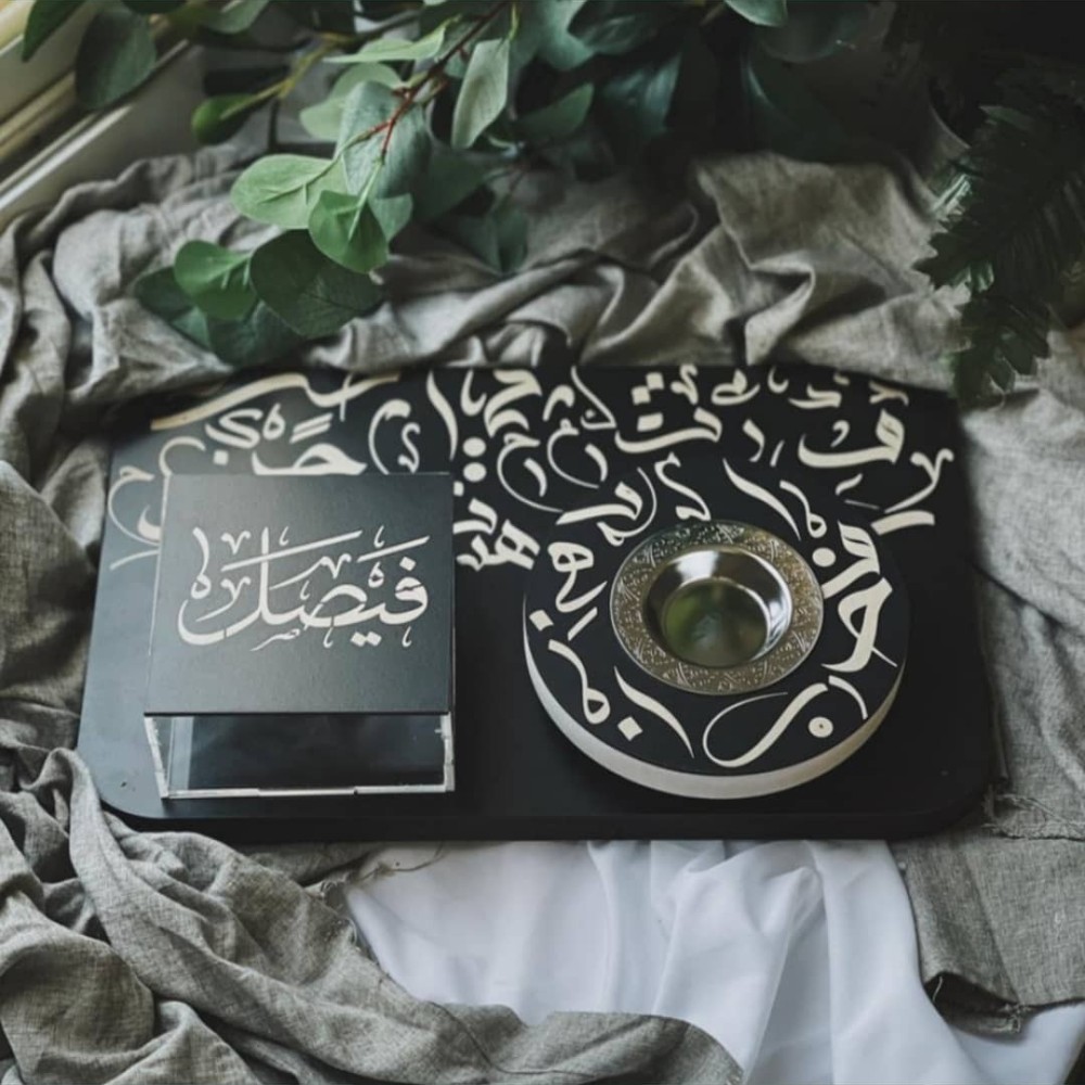 تحتوي مبخرة الحرف العربي على صندوق بخور، صينية، مبخرة بحجم كبير.