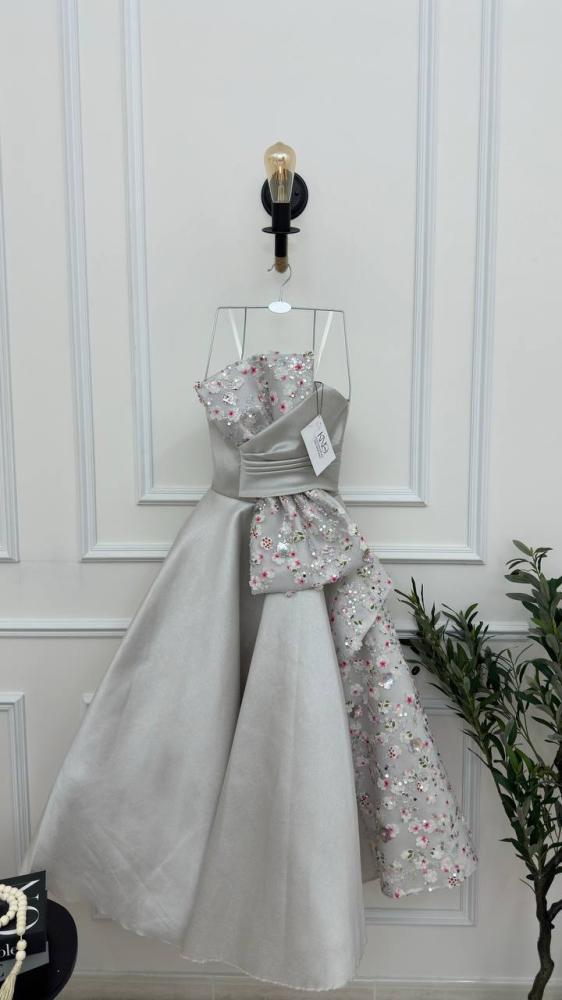 فستان رصاصي بلمعة بأكتاف مكشوفة وتفاصيل زهور ملونة