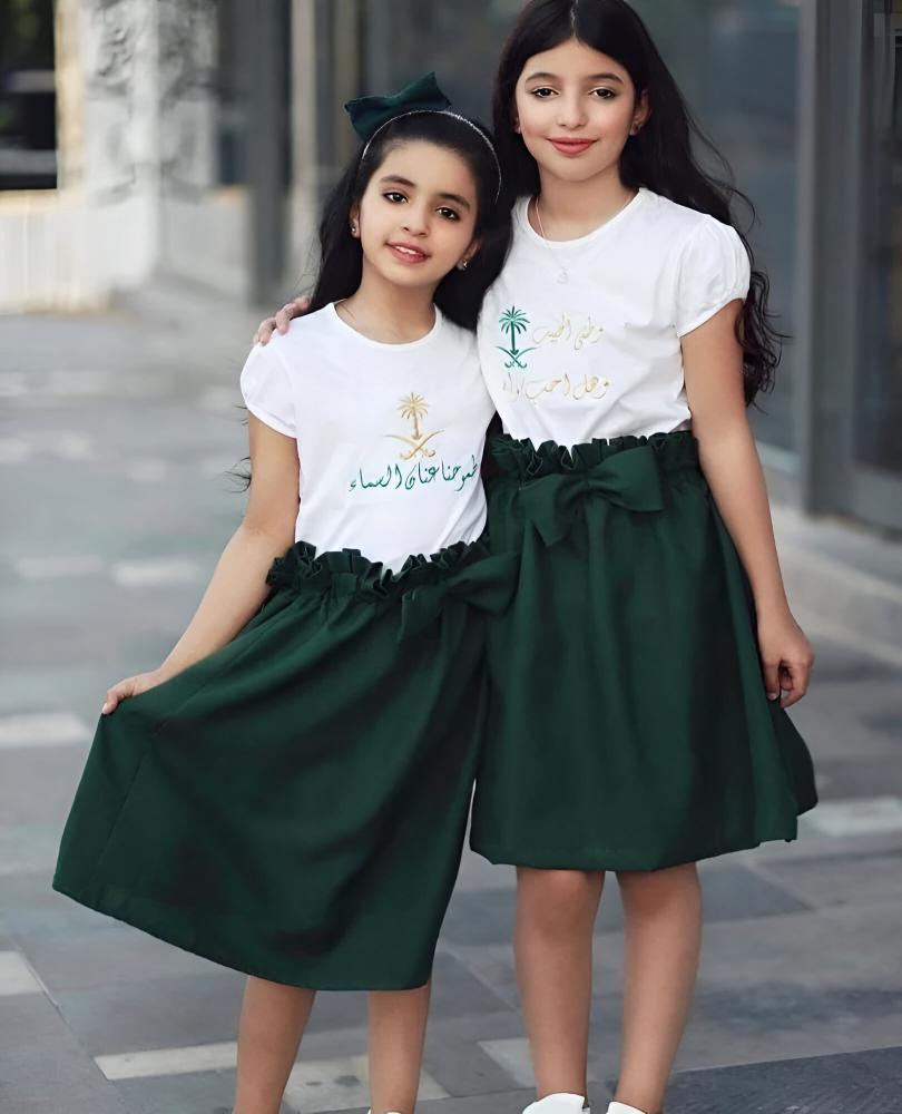 - نوع التصميم: تيشيرت أبيض مطرز بعبارة "دام عزك يا وطن" و صورة علم المملكة العربية السعودية، تنورة خضراء منفوشة بطول الركبة